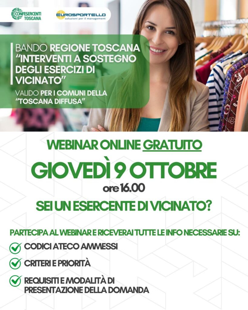 Si informa che è in programma per giovedì 9 ottobre alle ore 16 il webinar gratuito a cura di CONFESERCENTI TOSCANA ED EUROSPORTELLO sul contributo regionale per gli esercizi di vicinato della “Toscana diffusa”.
