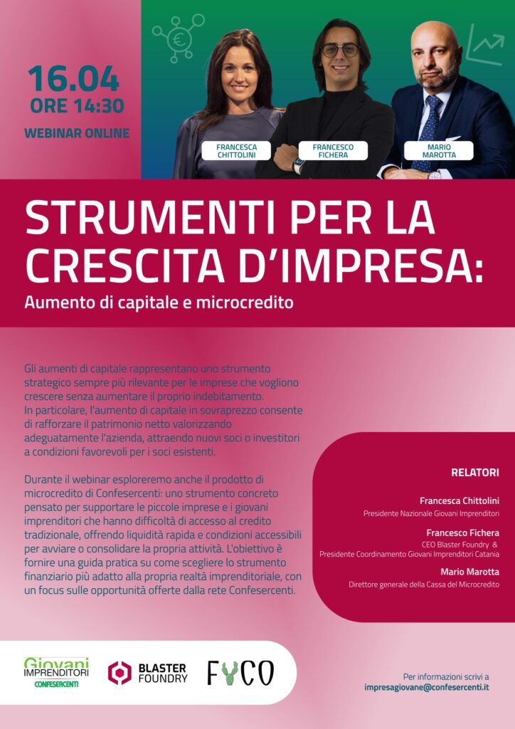 Durante il webinar esploreremo anche il prodotto di microcredito di Confesercenti: uno strumento concreto pensato per supportare le piccole imprese e i giovani imprenditori che hanno difficoltà di accesso al credito tradizionale, offrendo liquidità rapida e condizioni accessibili per avviare o consolidare la propria attività. L’obiettivo è fornire una guida pratica su come scegliere lo strumento finanziario più adatto alla propria realtà imprenditoriale, con un focus sulle opportunità offerte dalla rete Confesercenti.